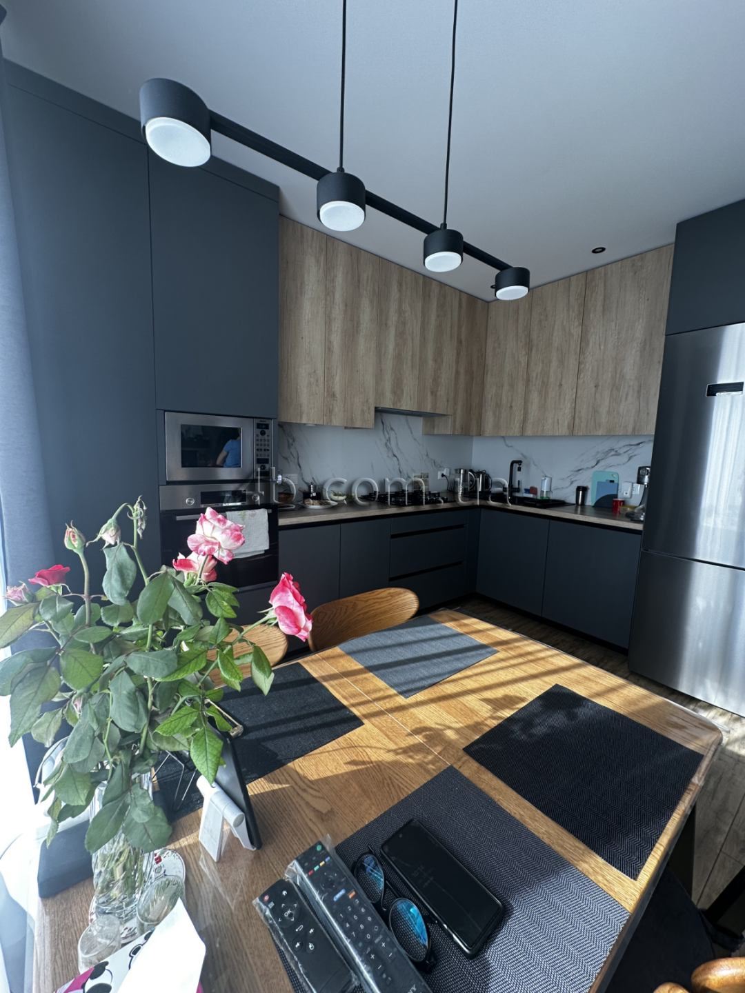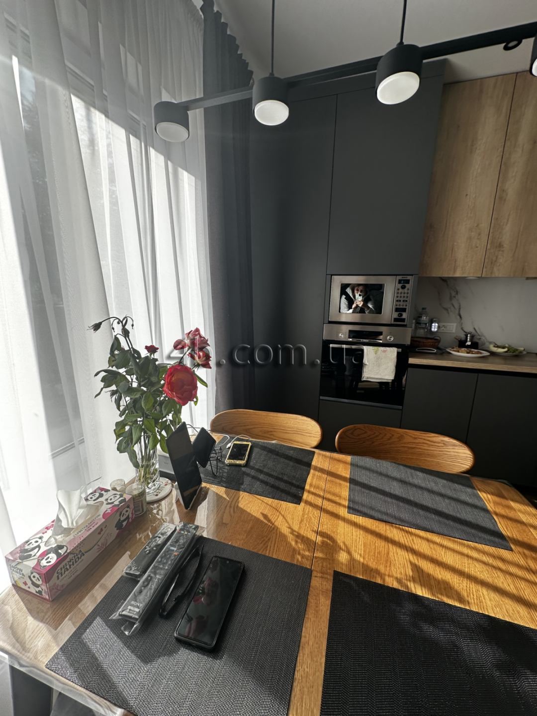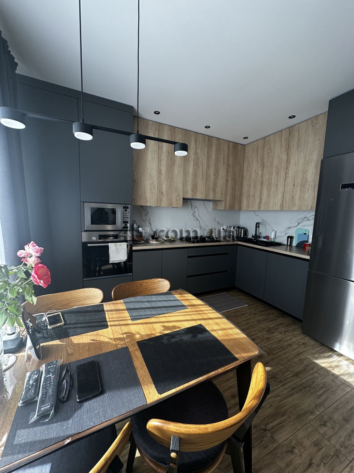 На першому поверсі: кухня - вітальня, передпокій з вбиральні, санвузол, тех. приміщення. Всі меблі на кухні зроблені на замовлення, техніка відомих світових брендів.