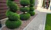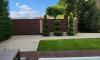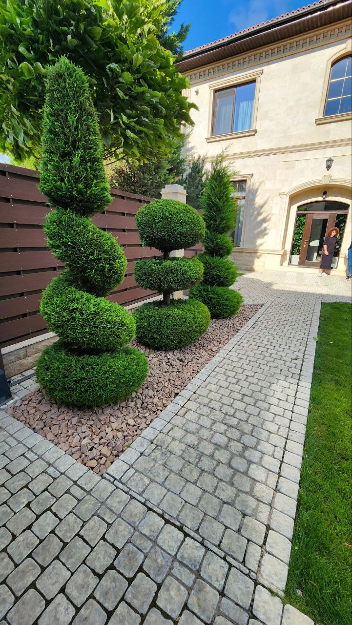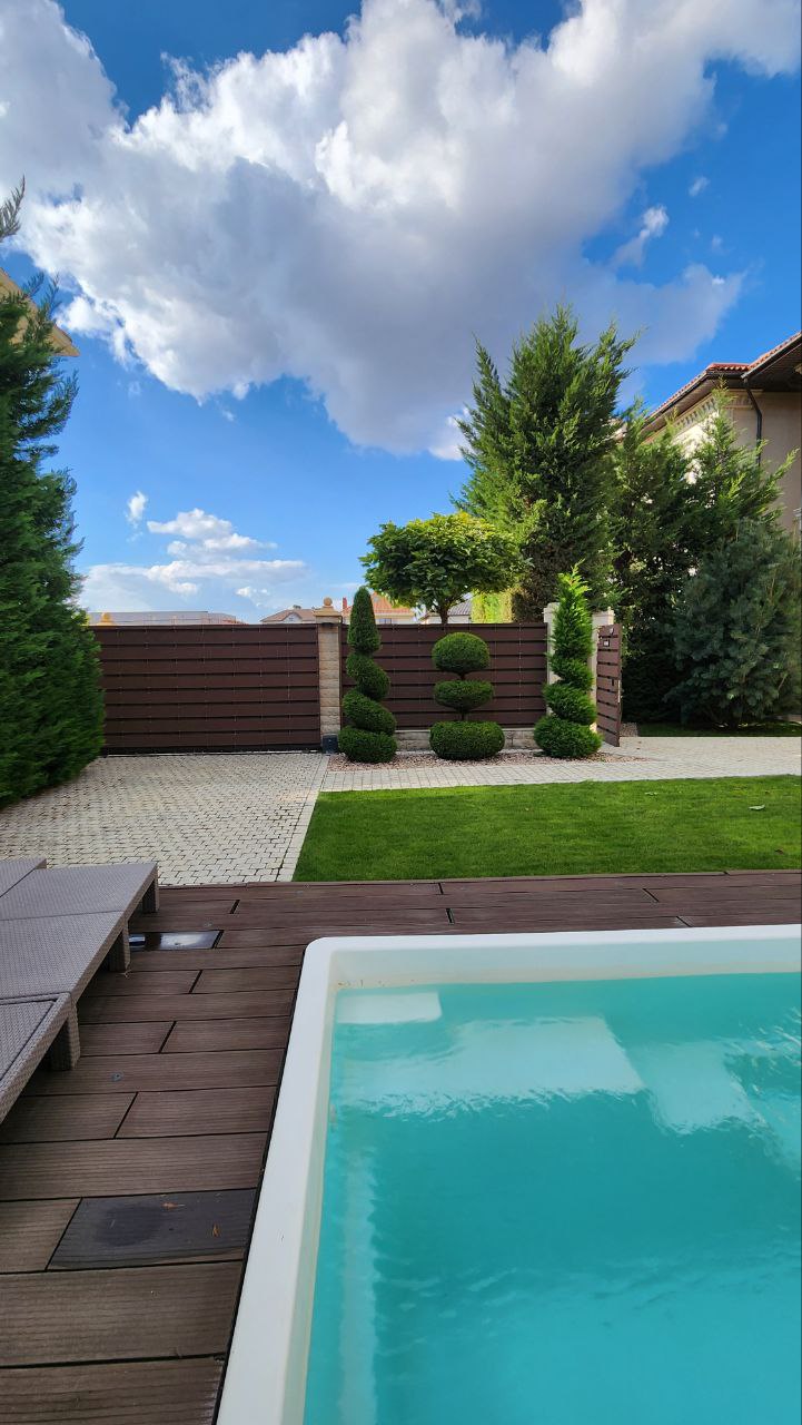 Ділянка доглянута, з басейном, зеленим газоном і хвойними деревами.