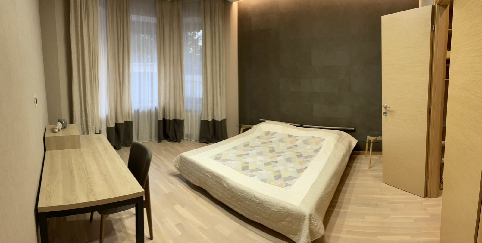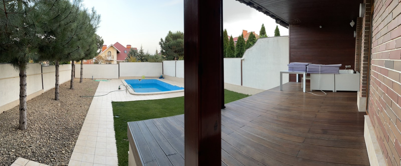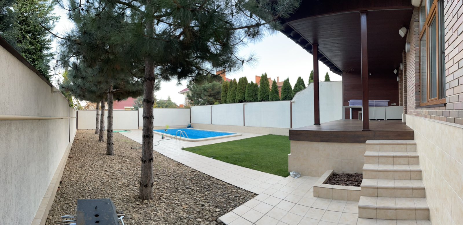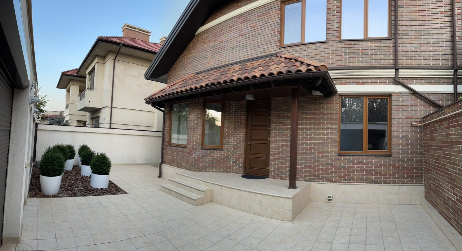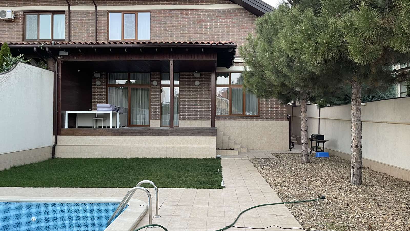 Дом 3-х уровневый, из красного кирпича. Sдома=313,4 кв.м. 1-ый этаж: кухня (25,1 кв.м.), гостиная (23,8 кв.м.), холл (29,6 кв.м.), топочная (13,2 кв.м.), комната (17 кв.м.), с/у (7,5 кв.м.), гардероб (6,1 кв.м.). 2-й этаж: 2 спальни (25,6+18,1 кв.м.), во всех комнатах гардеробные (10,3 кв.м.), с/у (14,3 кв.м.) + сауна (3,4 кв.м.), коридор (7,7 кв.м.), тренажерный зал (26,5 кв.м.). 3-й этаж: мансарда (65,7 кв.м.). Крыша натур. черепица (Испания), окна м/п «золотой дуб», роллеты автомат. Площадка для машин. Терраса из «мербау». Бассейн. Автополив. Дом меблирован. Оснащен кухонной техникой фирмы «Barazza», сантехника подвесная «Villeroy & Boch», краны Италия, душевые Германия, мебель Италия, кухня навесная (Италия) со всей техникой (холодильник, посудомоечная машина и т.д.), домашний кинотеатр. Интернет оптоволокно, спутниковое телевидение, мультирум, видеонаблюдение.