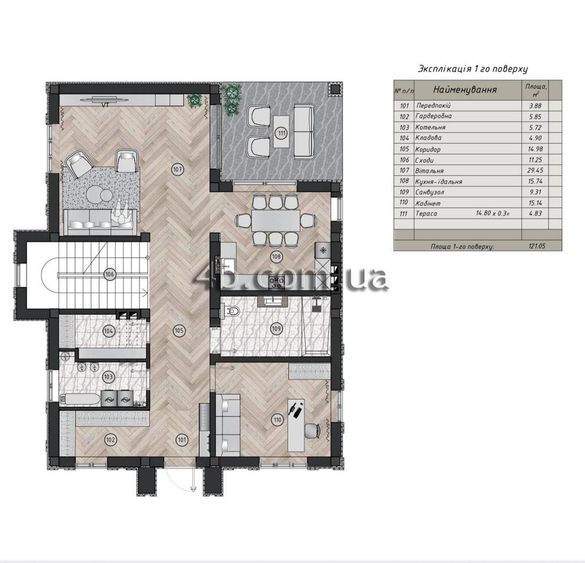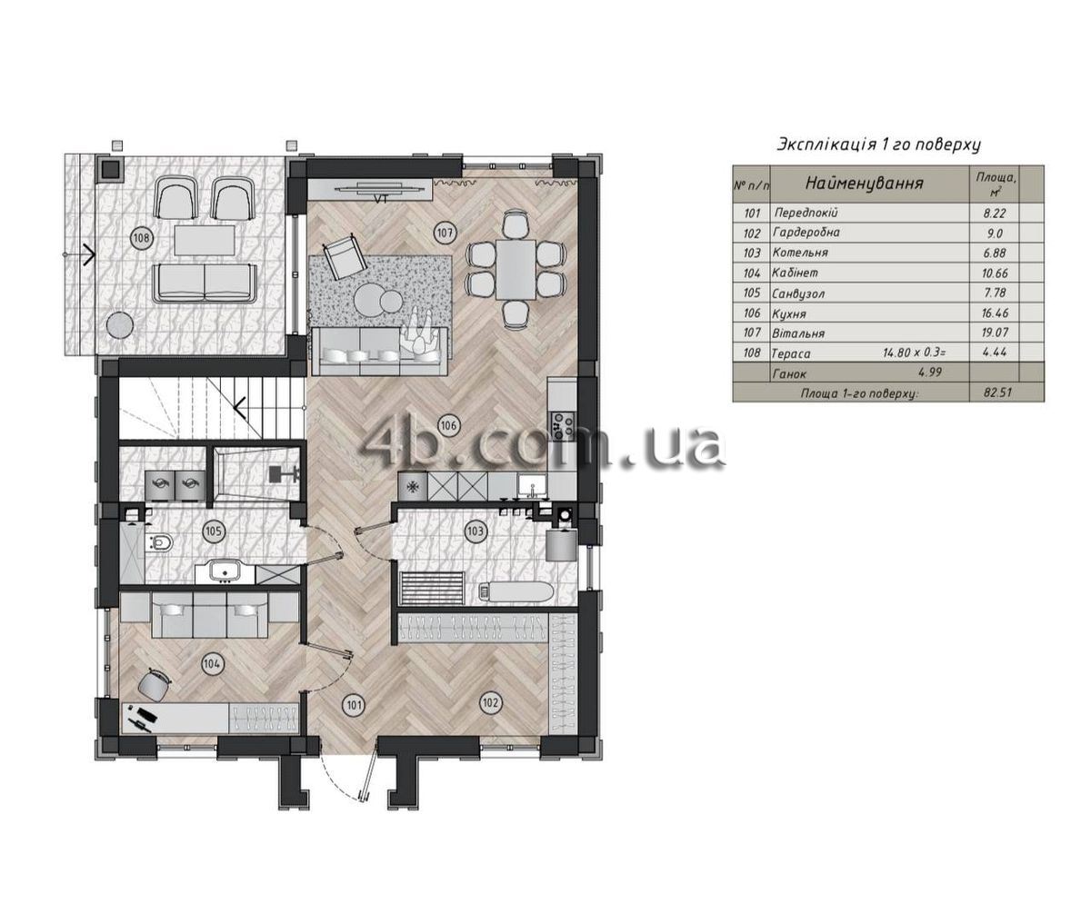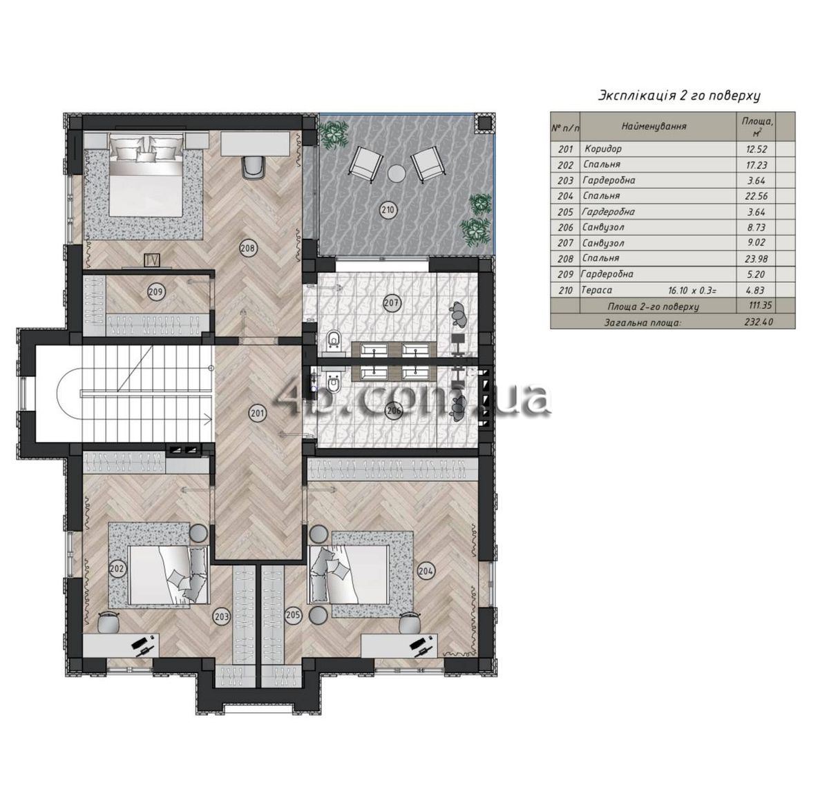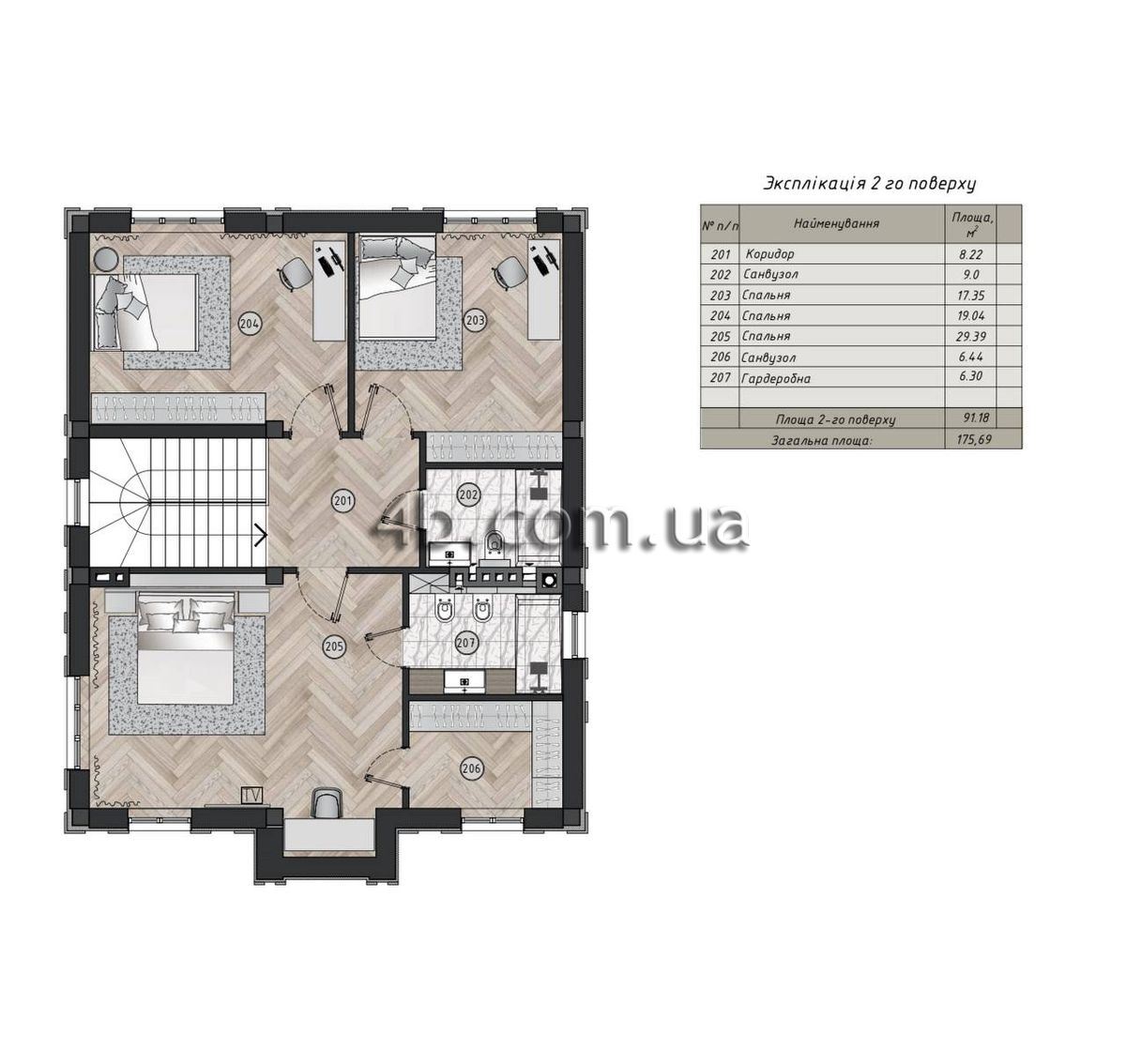 4 спальні, вітальня, кухня-столова, з гардеробні, з санвузли.