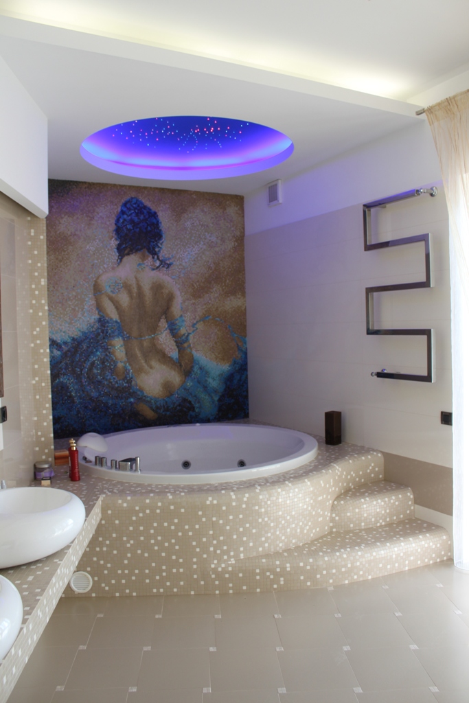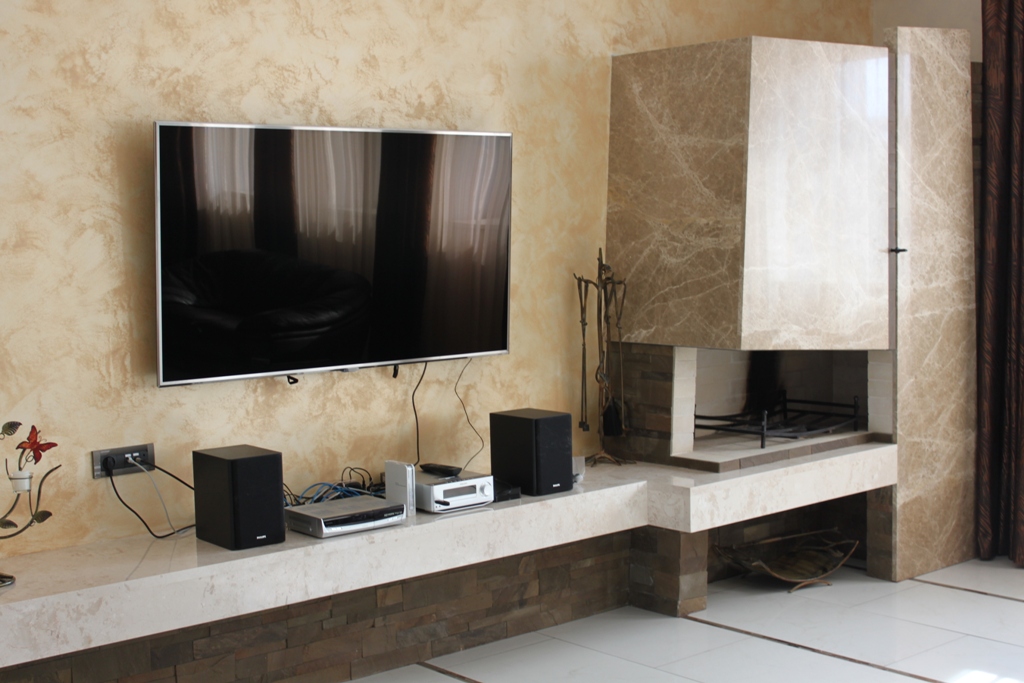 На першому поверсі зона відпочинку представлена величезним диваном, телевізором (діагональ 75) та красивим електрокаміном.